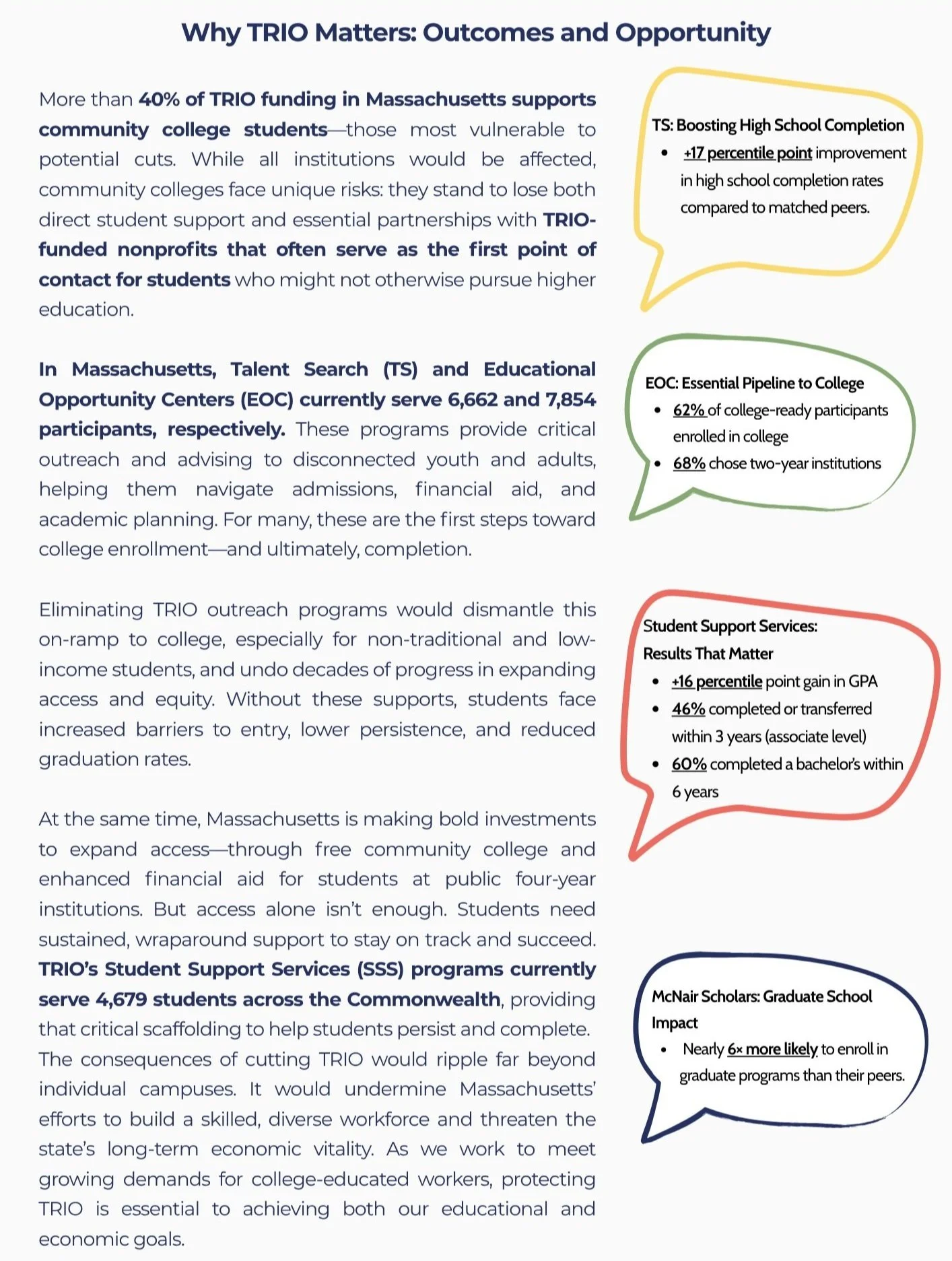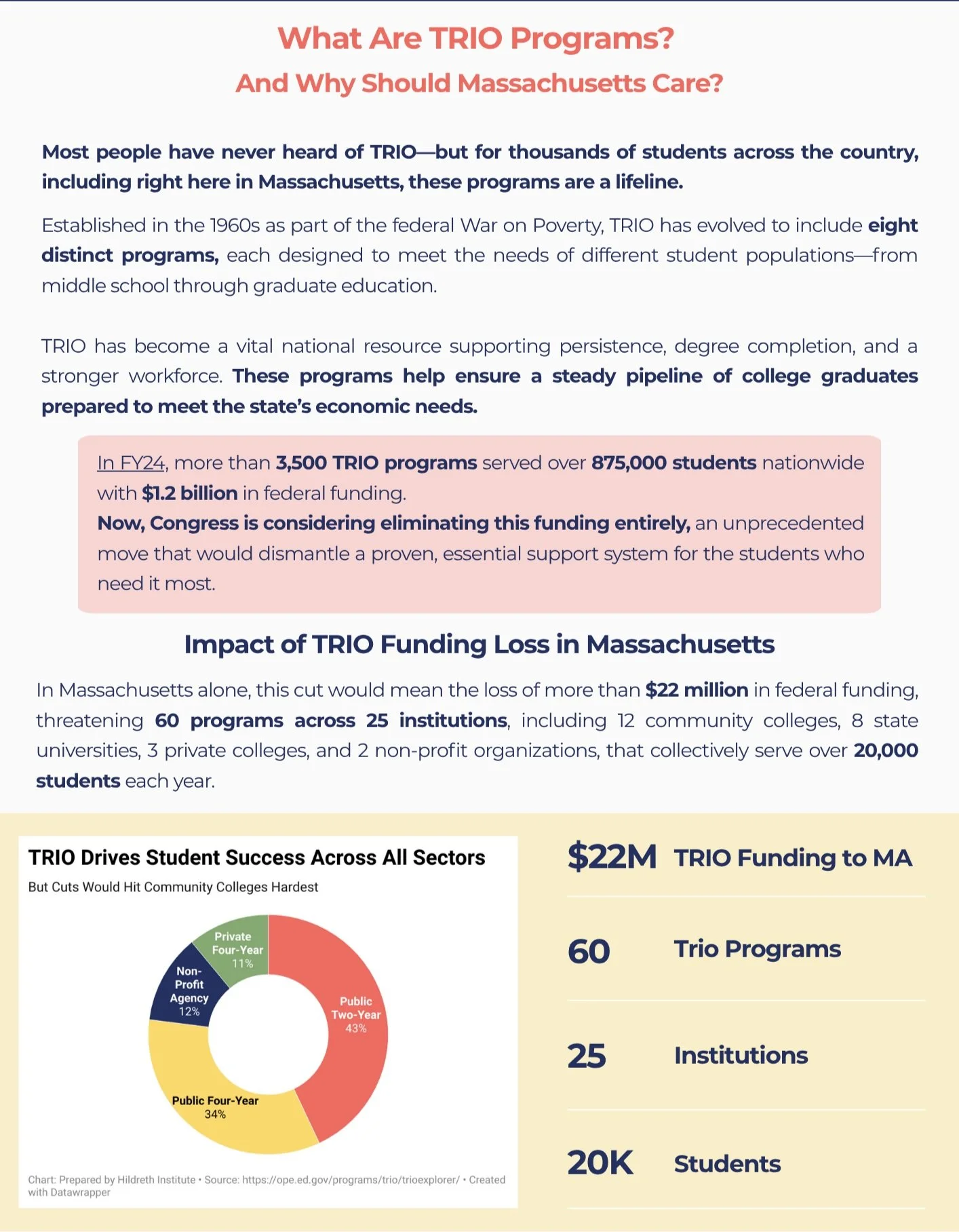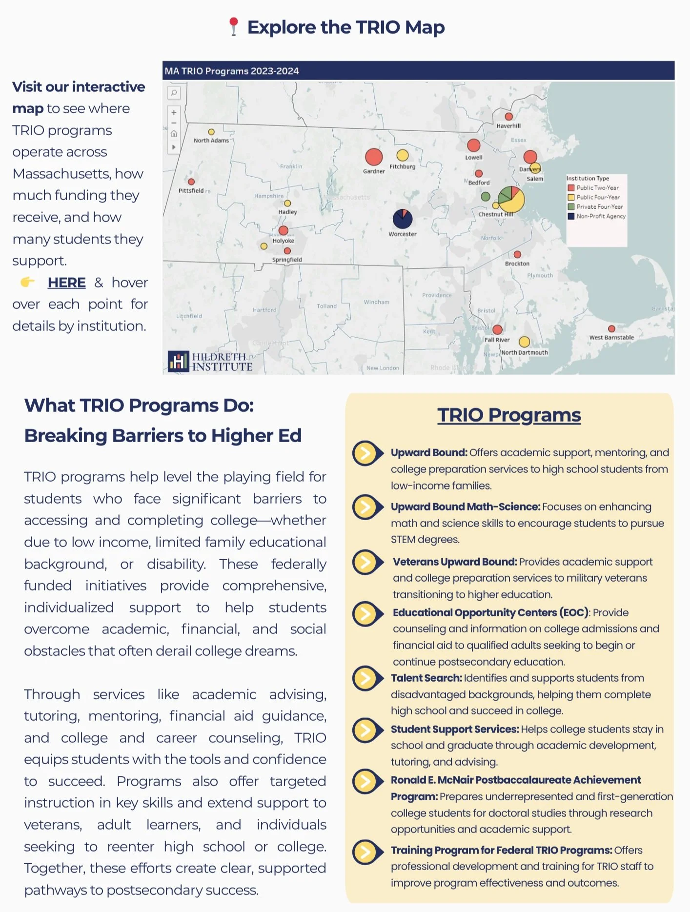 What Are TRIO Programs? And Why Should Massachusetts Care? Fact Sheet May 13 Written By Hiba Agha Download PDF Explore the Interactive Map Click here to return to the full Fact Sheet Series. Federal HE Cuts Hiba Agha